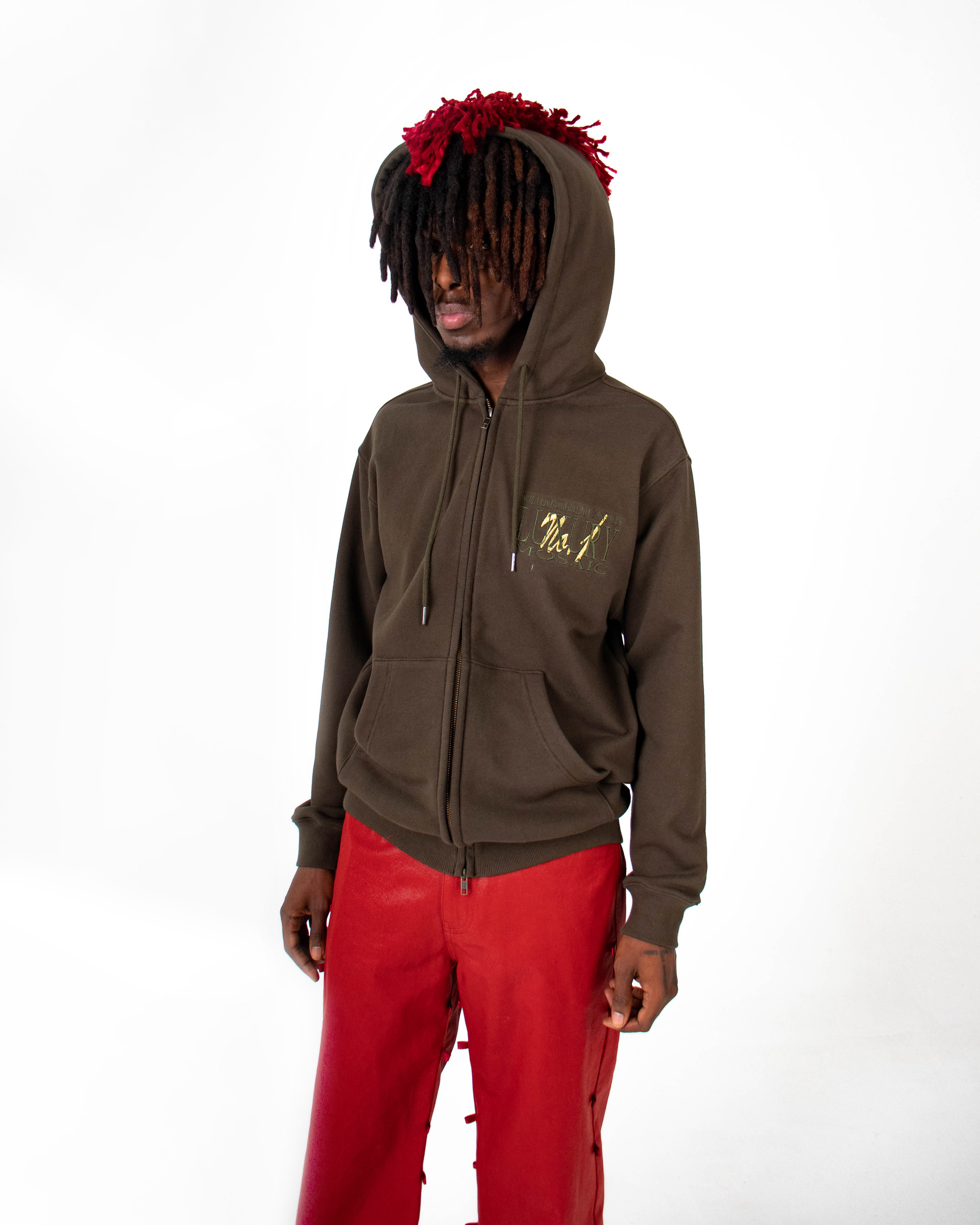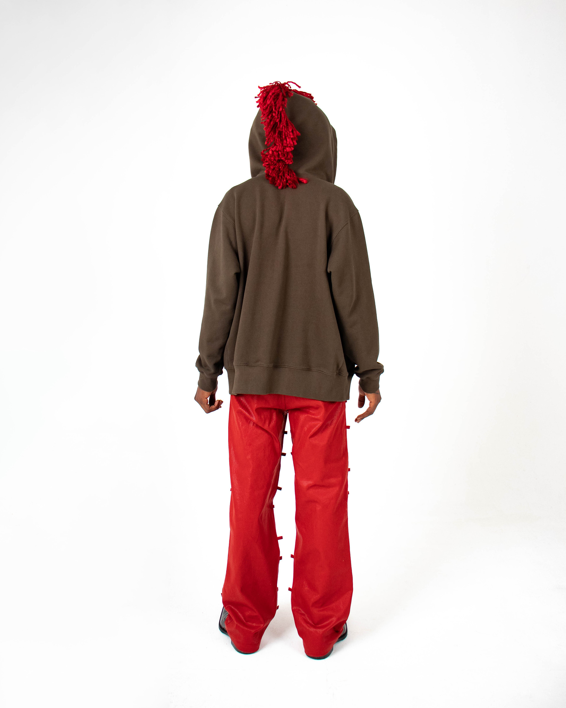 - Red fringe detail on the hood